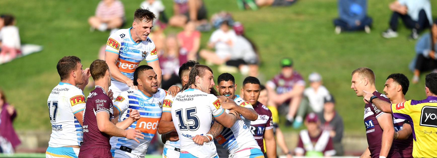 Titans winger Corey Thompson scored in the 23rd minute after managing to avoid putting his foot on the touchline as he planted the ball in the corner while being tackled by Hopoate after taking a looping pass from halfback Jamal Fogarty.